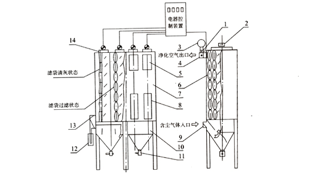 反吹空氣通過電動三通閥進入箱體后,與過濾狀態相比反向通過濾袋,與此同時,高頻電振器開始動作,使濾袋隨這作高頻震動。在反吹及高頻振動的同時作用下起到清灰的效果(清灰時間是可調的)。清灰結束時高頻電振停止振動。電動三通閥主閥板打開,付閥同時關閉,又恢復了正常過濾狀態??梢园凑招枰{整清灰的相鄰間隔時間、使各箱體按指定的時間依次序進行清灰。
