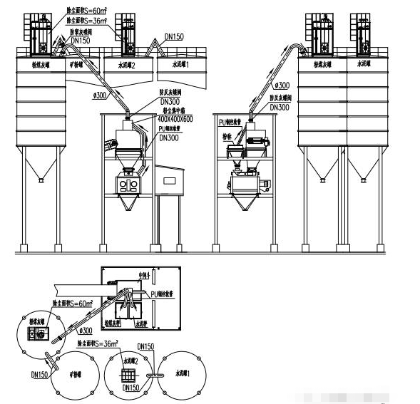 4、徹底解決主樓內(nèi)的生產(chǎn)揚(yáng)塵問題。主樓生產(chǎn)過程中產(chǎn)生的粉塵,通過PU鋼絲軟管管道,集中至砂石待料倉頂部的粉塵集中箱,然后通過倉頂除塵器上的風(fēng)機(jī)和∮300管路,將粉塵全部抽到粉煤灰倉內(nèi),再經(jīng)過除塵器過濾反吹后直接落入粉煤灰倉。