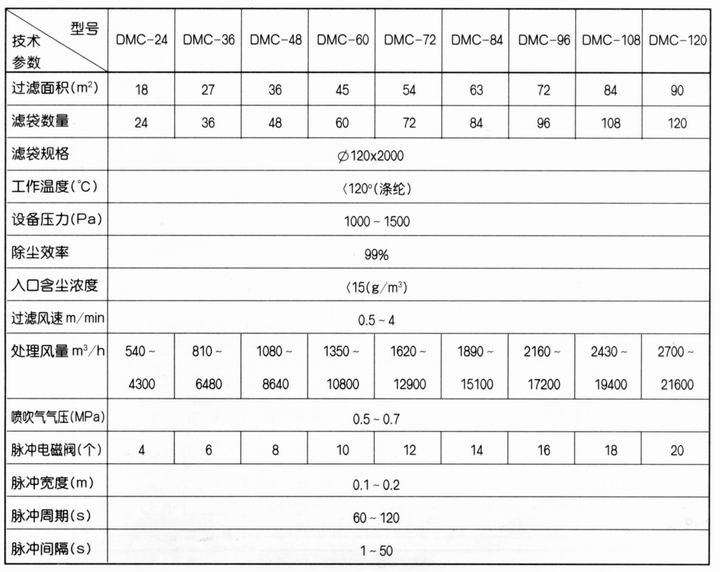 DMC型脈沖袋式倉頂除塵器 DMC型脈沖袋式倉頂除塵器適宜布置在各種粉料貯存庫的頂部,用于捕集各種細小干燥非纖維粉塵。 主要技術參數(shù): DMC型脈沖袋式倉頂除塵器主要技術參數(shù)見表,在選型時應注意入口粉塵濃度,在技術性能上,透過濾袋的氣流速度(即過濾風