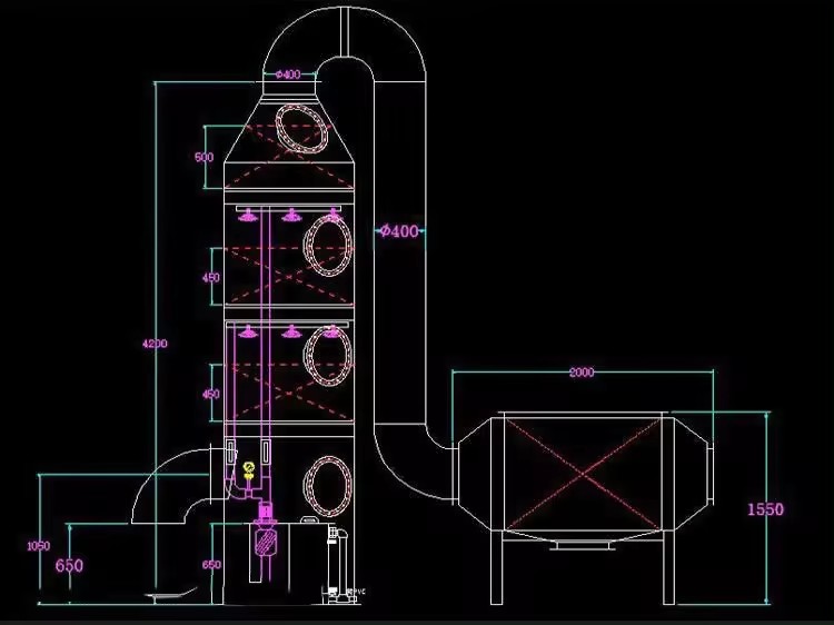 廢氣由風(fēng)機(jī)引入噴淋塔,內(nèi)筒形成壓力室,壓力室均勻分布到每個(gè)鼓泡管。廢氣通過鼓泡管,進(jìn)入液體吸收罐吸收鼓泡液體,然后氣泡通過填料層。氣-液兩相與吸收中和反應(yīng)完全接觸。水經(jīng)塔底的水泵加壓后噴在塔頂,最后返回塔底回收,并且吸收和過濾后的廢氣繼續(xù)向上流動(dòng)并被噴射。管子噴出的吸收中和液產(chǎn)生最終反應(yīng)。中和反應(yīng)后,末端除霧板脫水除塵后的氣體排入大氣,它也可以與光氧催化或低溫等離子體和活性炭氣體凈化設(shè)備結(jié)合使用。處理后廢氣達(dá)到地方或國家排放標(biāo)準(zhǔn)和排放要求