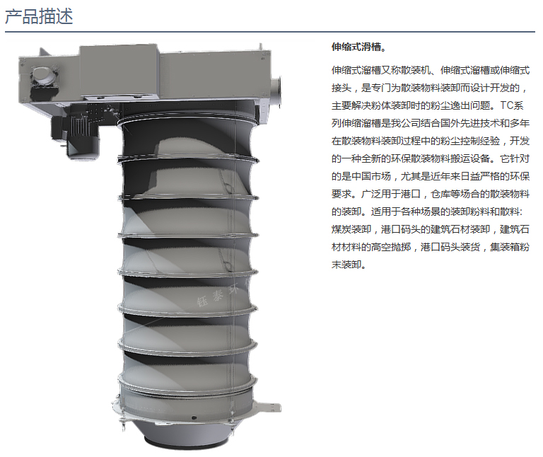 1.伸縮溜筒配套除塵器系統(tǒng),通過(guò)抽氣來(lái)收集裝料時(shí)產(chǎn)生的灰塵。