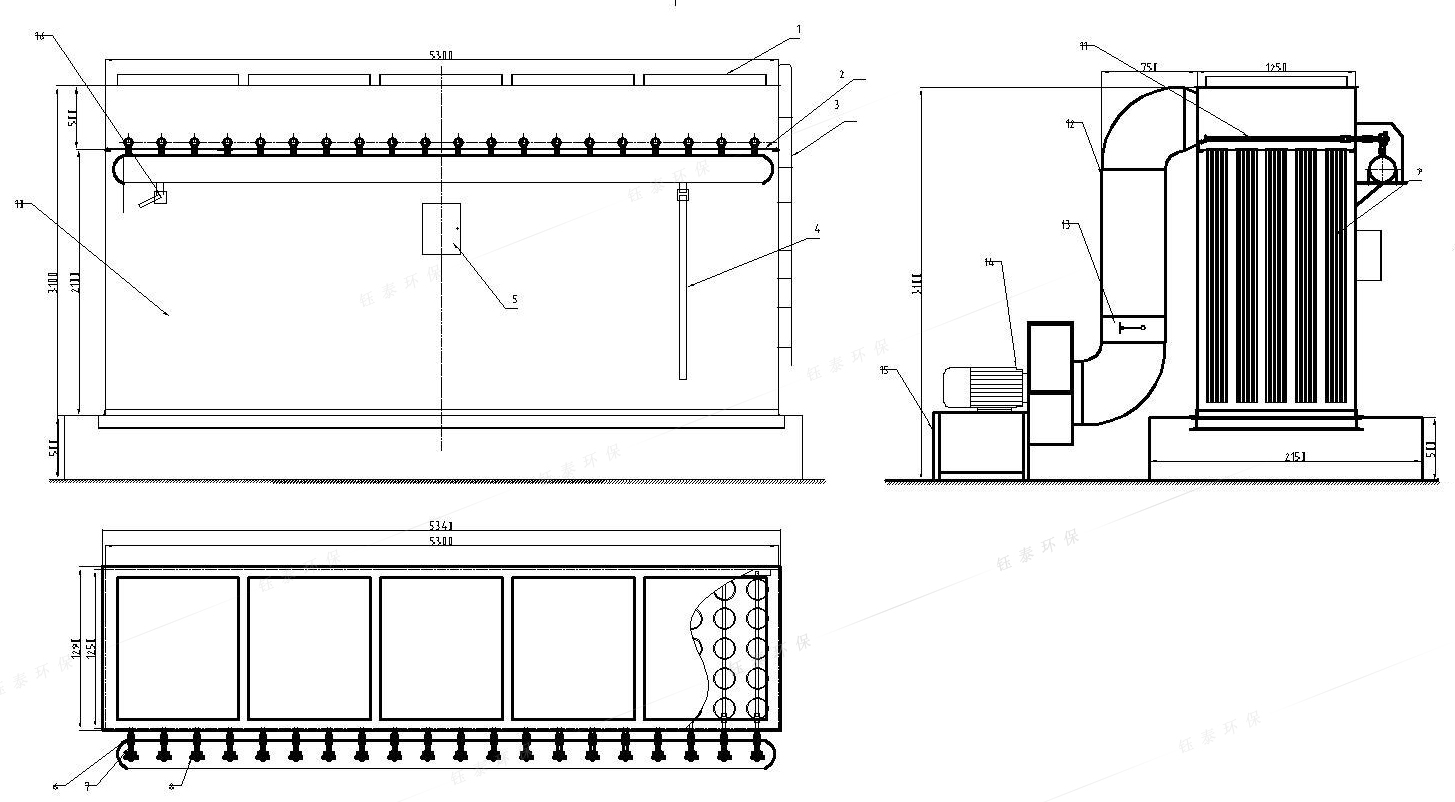 改造后,灰?guī)斓拿繂闻_庫頂布袋除塵器技術參數:處理風量17000m3/h、過濾風速1.0m/min、過濾面積240m2,濾袋耐溫135℃、抽塵風機出口含塵濃度≤10mg/Nm3。除塵器外型尺寸為原除塵器外殼尺寸:5.3×1.25×3.1m(高)